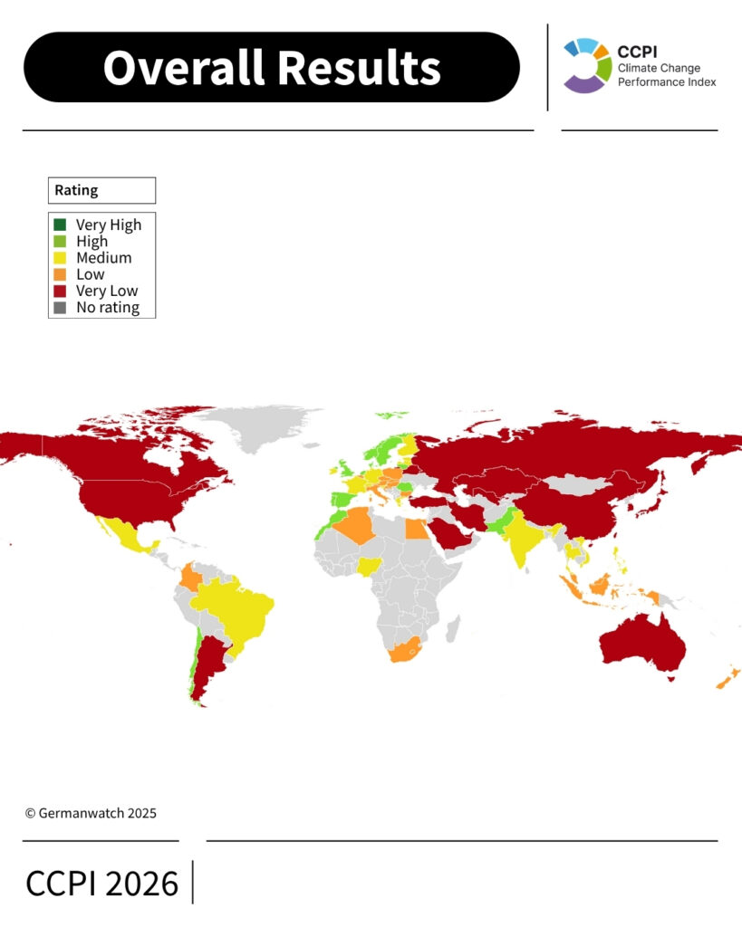 Il “Climate Change Performance Index 2026”analizza 63 Stati più l’Unione Europea, che insieme rappresentano oltre il 90% delle emissioni globali. L’indice valuta quattro parametri: andamento delle emissioni (40%), rinnovabili (20%), efficienza energetica (20%) e politiche climatiche (20%). Ebbene, nessun Paese raggiunge la soglia delle performance compatibili con 1,5 °C. Ma alcuni avanzano.