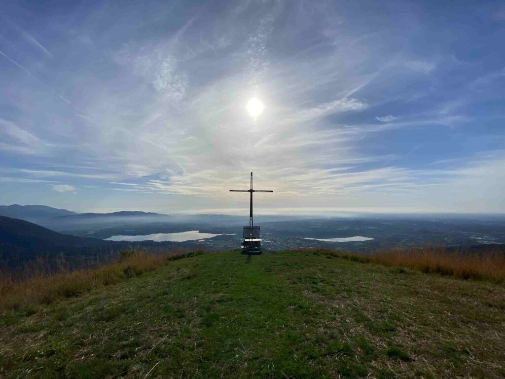 Superata la Capanna Mara, un sentiero più stretto devia sulla destra, in corrispondenza della bandiera italiana, e conduce verso la Croce di Maiano. Qui la pendenza aumenta leggermente, ma solo per pochi minuti. L’arrivo è annunciato da uno spiazzo erboso che si apre all’improvviso, regalando una vista ampia e pulita. A circa 1.200 metri di quota, lo sguardo spazia sui laghi di Pusiano e Annone, sulle colline brianzole e, nelle giornate terse, sull’intera distesa della pianura fino agli Appennini. È un punto di osservazione privilegiato, dove il paesaggio invita a fermarsi, sedersi e lasciare scorrere il tempo.